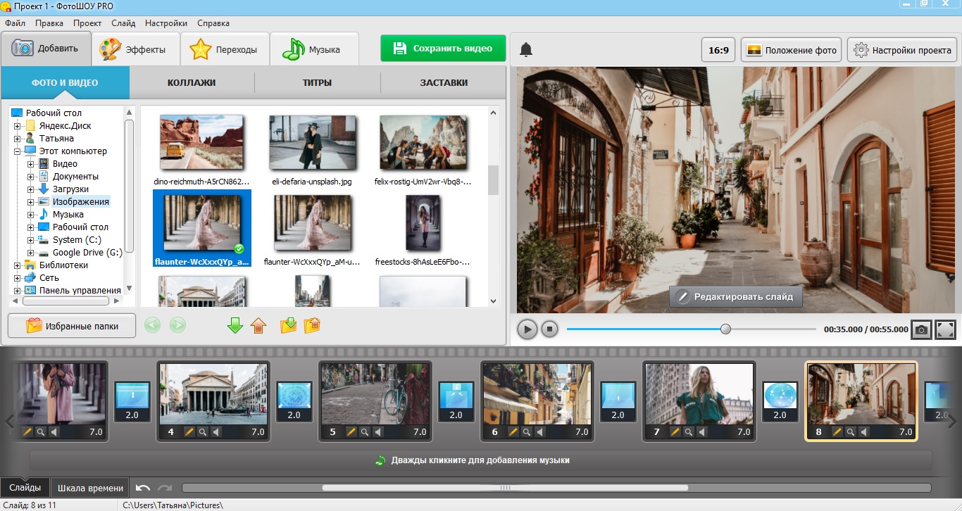 Добавьте фотографии и видеофайлы, из которых будет собираться видеоклип. Для этого в левом столбце-проводнике выделите папку с медиафайлами и перетяните материалы из центрального окошка на шкалу раскадровки.