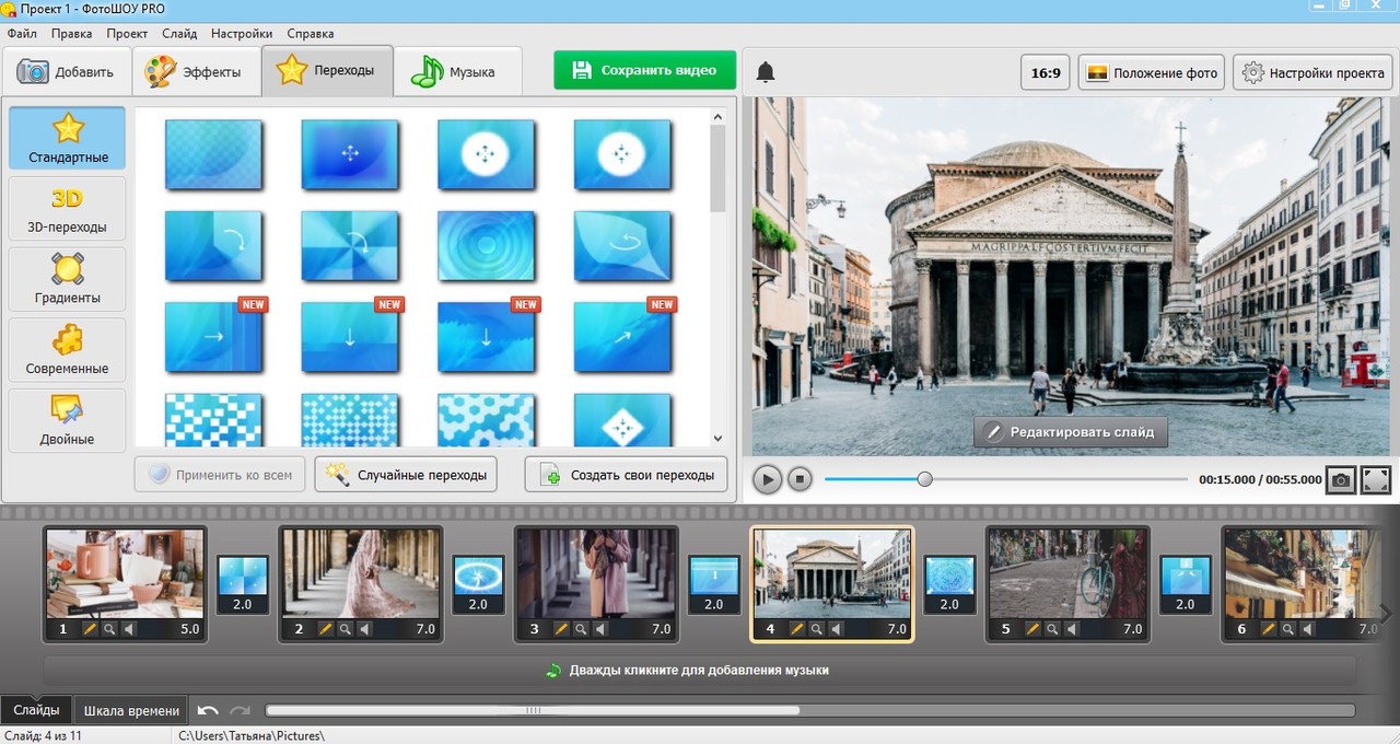 ФотоШОУ PRO сразу встраивает между слайдами переходы, но вы можете настроить смену кадров самостоятельно в одноименной вкладке. Нажмите на шаблон, чтобы просмотреть результат, а для добавления дважды кликните по выбранному стилю.
